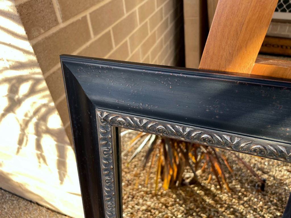 High Quality Picture Frame Moulding Circa Classic Antique Style Aged Black Finish Featuring a Ornate Aged Silver Trim Traditional Profile to Wooden framed Wall Mirror Ready to Hang